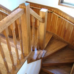 階段もタモ材で明るさを採るため、開放的なササラ桁の造りです。二階から見た曲線がとてもキレイです。構造材も大工の手刻みです。