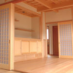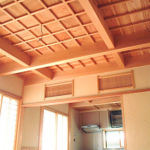 室内LDK天井には、現在厳しい伐採制限されている東北青森の青森ヒバ梁を組み合わせて、梁間にはヒバ材の格天井としました。床材もめずらしいラオス松柾材を使用。各洋室造作材にはLDKの雰囲気を損なわないような材種ということでヒマラヤ杉を提案。和の空間に良く合う材料を大工ならではの知識と経験でアドバイスさせていただきました。