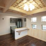 「親子二代が仲良く暮らせる」そんな家にしたいというお客様の声に、家族みんなの動線計画、収納設置など半年以上何度となく打合せを行いました。親世帯LDK(1階)には、ふと何かぶつけても傷にならないように高級感漂うタモ材の腰板を計画。腰板は、後の手摺り設置や大型テレビの設置など、下地要らずで簡単に取り付けられ衝撃にも強く、意外と重宝するとご存知でしたか?