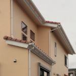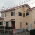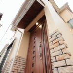 少し濃いアイボリー色がきれいな二世帯住宅。